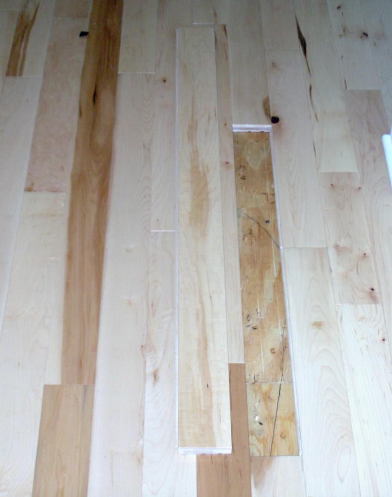 Make sure you cut away the tar paper,vacuum out any debris and check for any high spots in the sub-floor where flooring staples were pulled. Pick out the board you are to replace and make sure it's longer than the board you removed. This board will need to be cut on one end preferrably with a miter saw with a carbide blade,for a clean look.